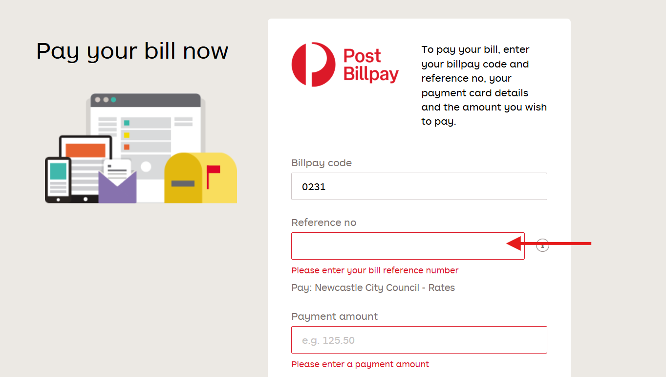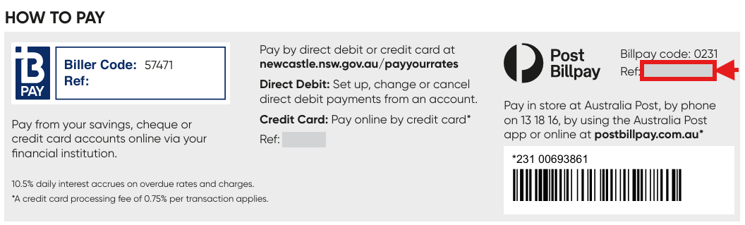 Post Billpay by calling 13 18 16 or visit Australia Post Billpay and pay by credit card use Billpay code 0231. Your reference number can be found next to the Post Billpay logo on the bottom of your rates notice. You can also pay in person at any Australia Post outlet.